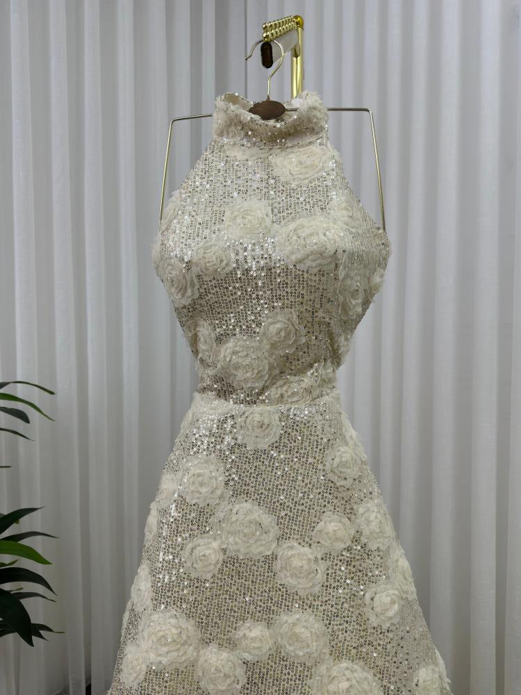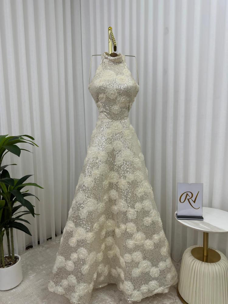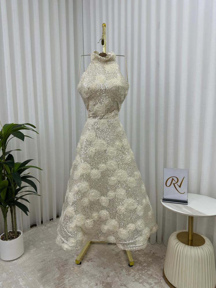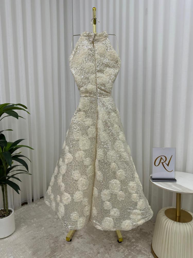 إطلالة ناعمة تخطف القلوب! فستان أوف وايت مطرز بالكامل بالترتر اللامع وتزيين ناعم بورود تمنحك حضور أنثوي فخم وأنيق.