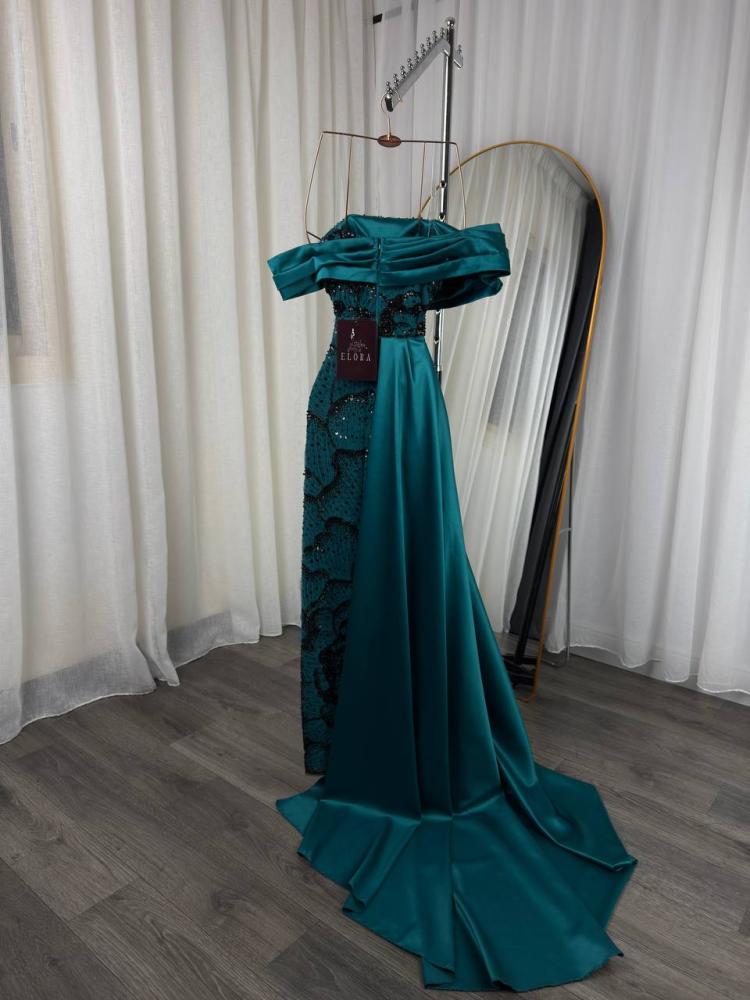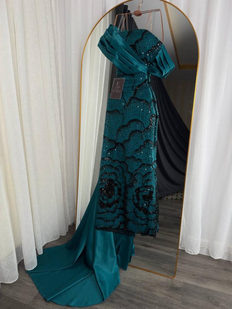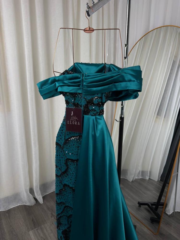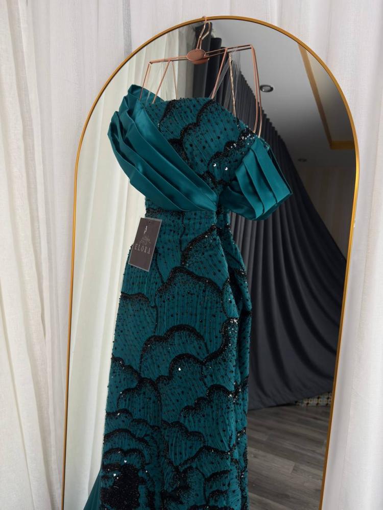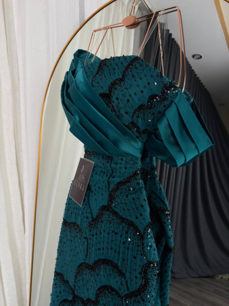 تألقي بأفخم إطلالة مع هذا الفستان الزمردي الساحر الذي يجمع بين الفخامة والرقي في تصميم واحد. تصميمه الأنيق بالأكتاف المنسدلة يمنحك حضورًا ملكيًا يخطف الأنظار، بينما تضيف التفاصيل المطرزة البراقة لمسة من الفخامة الراقية على إطلالتك.