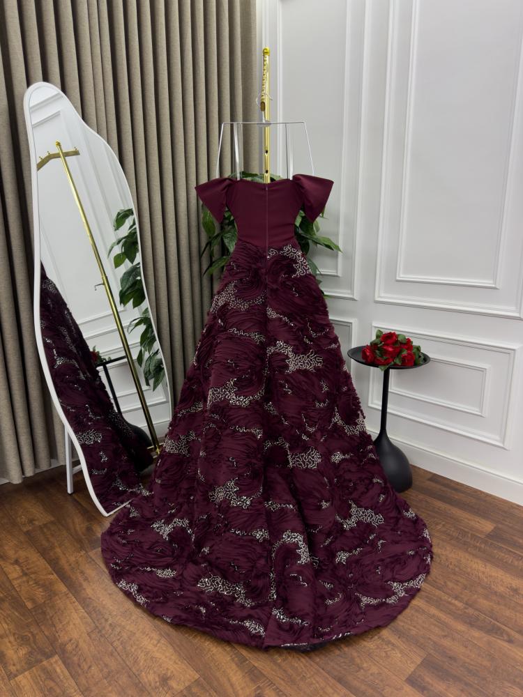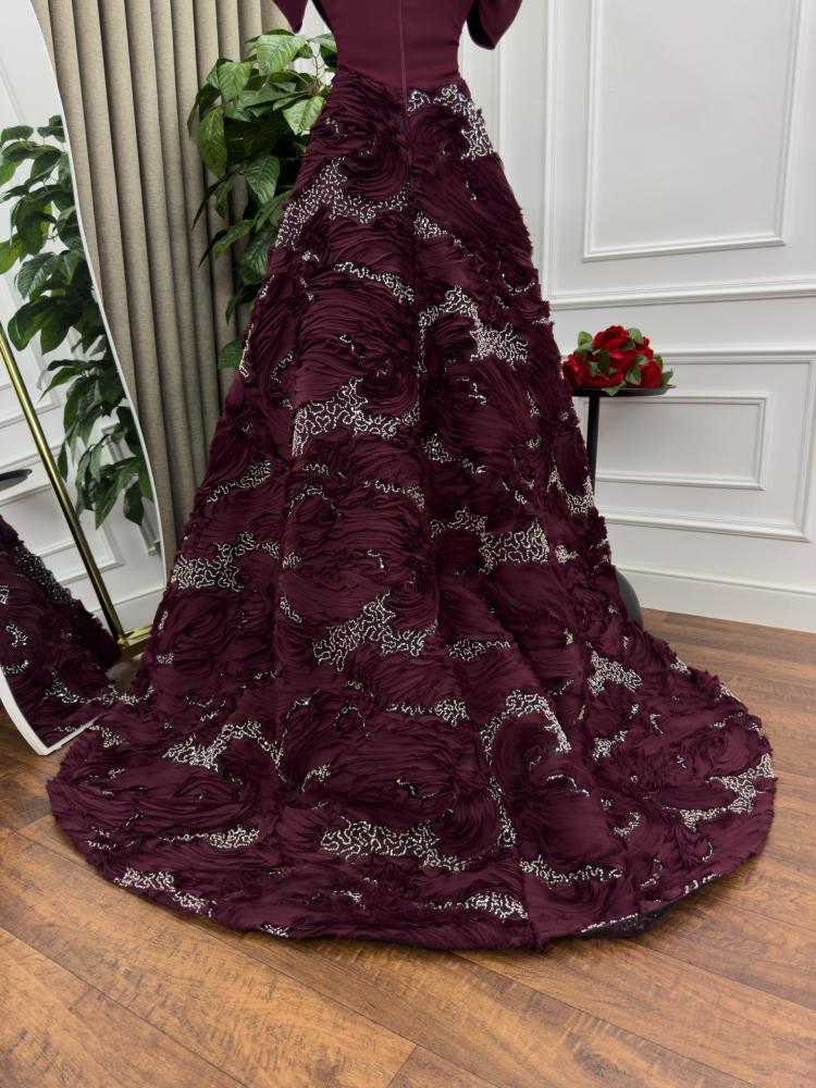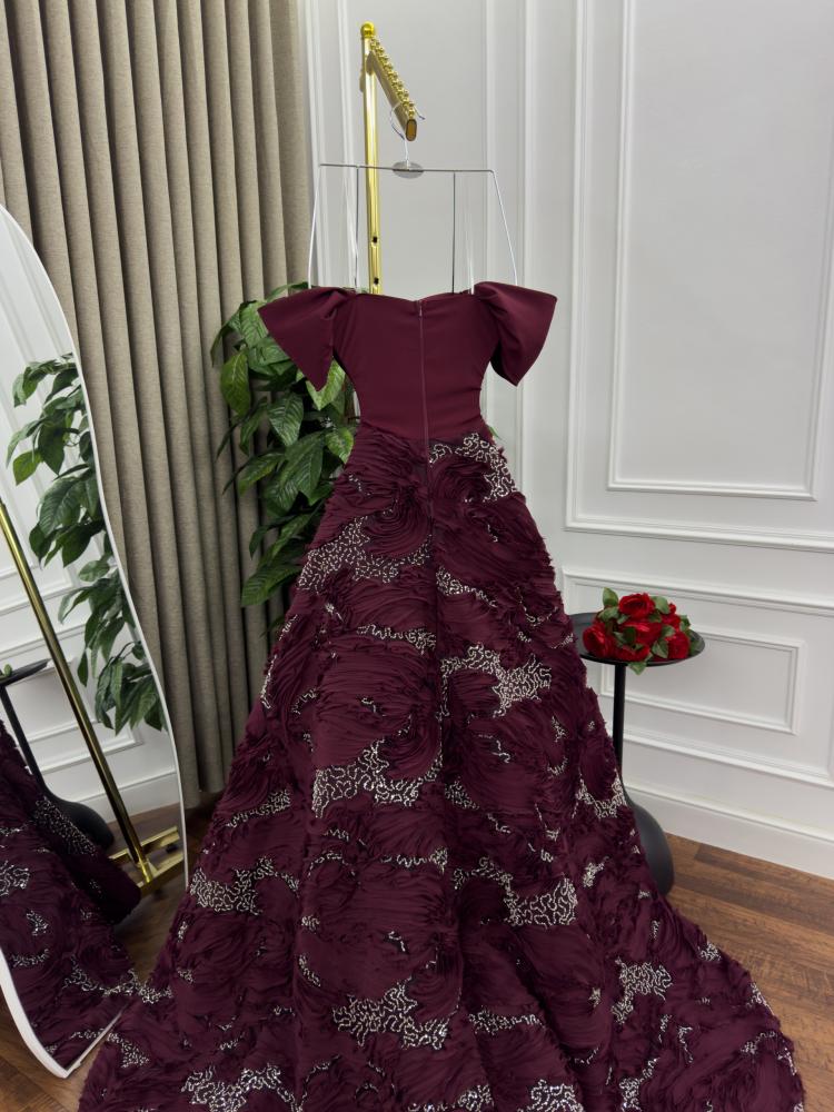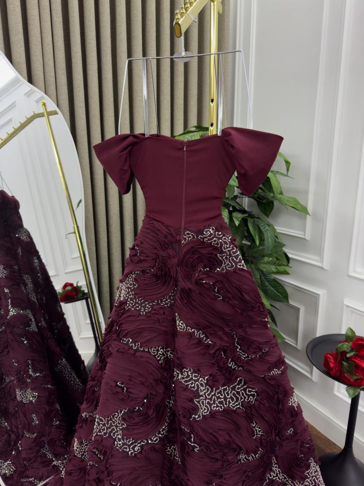 فستان ملكي بلون عنابي فاخر، بتصميم يجمع بين الرقي والهيبة. يأتي بكمّين على شكل فراشة تضفي لمسة درامية ناعمة، مع قصّة ضيقة تبرز جمال الخصر قبل أن تنساب التنورة بشكل واسع فخم. القماش مطرّز بتفاصيل متموجة أنيقة تنبض بالحياة، مرصّعة بتطريزات برّاقة تكمّل الفخامة وتضفي لمسة من السحر في كل حركة.