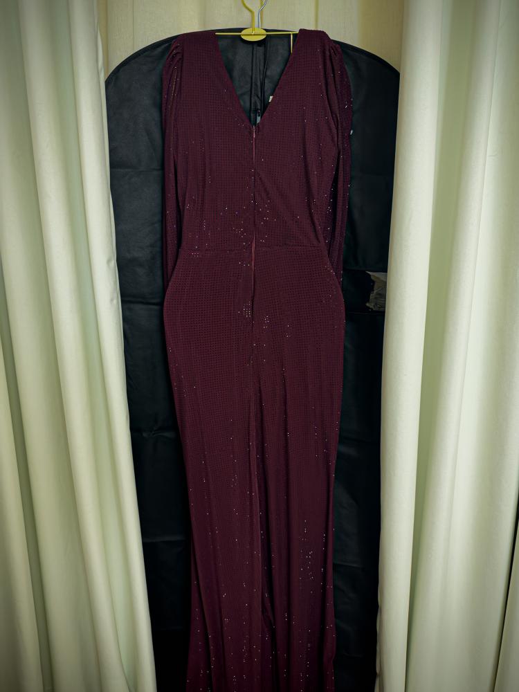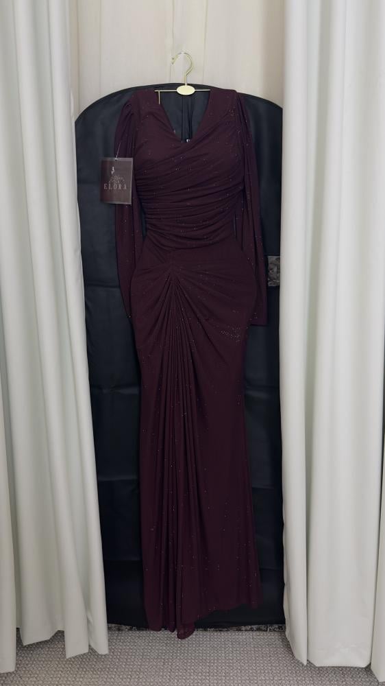 فستان طويل بتصميم ضيق مميز مع درابيه جانبي يبرز جمال القوام، وأكمام طويلة تعطيه طابعاً كلاسيكياً أنثوياً. القماش مزين بلمسات براقة ناعمة تضفي إشراقة ساحرة على الإطلالة. اللون العنّابي العميق يمنح حضوراً ملكياً يلفت الأنظار في كل مناسبة.