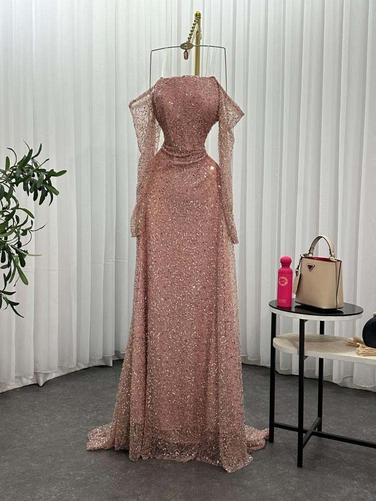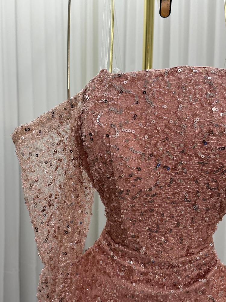 فستان سهرة أنيق بلون وردي لامع، يتميز بقصة ضيقة تبرز الخصر، مع أكمام شفافة طويلة منسدلة تضيف لمسة راقية، وتنورة طويلة تنسدل بانسيابية مع ذيل خفيف. التصميم مزين بالكامل بالترتر اللامع لإطلالة فخمة وملفتة.
